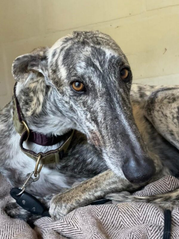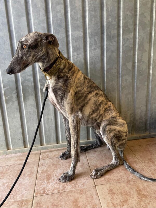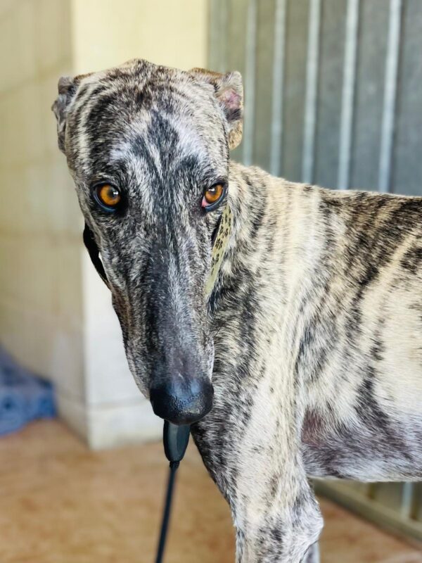 Buñuelo is a galgo from a village in Seville. He was abandoned and left to fend for himself. Some girls saw him wandering the streets and organized to track him until they could catch him. They couldn’t take him in and asked us for help. We didn’t hesitate to step in.