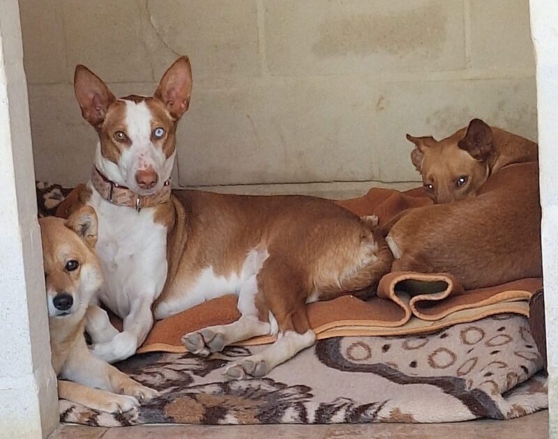 Iris is shyer and more cautious than her brother. She still needs to trust humans, but we’ve seen improvement and are sure that at home she will improve with time and patience. Iris gets along very well with other dogs, and we’re asking that she be placed with a family that has another, more sociable dog, who will help her even more. Iris is a young, playful dog and has the typical energy of a Podenco. Also, during our basic cat test, she showed no interest in the cat.