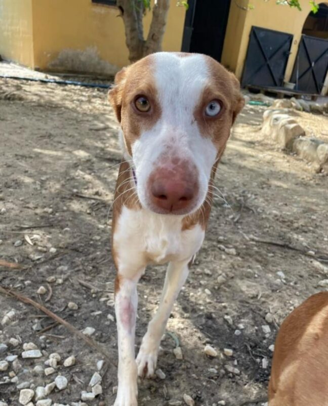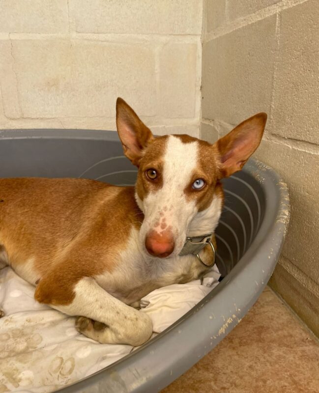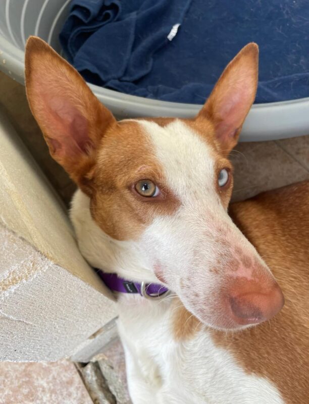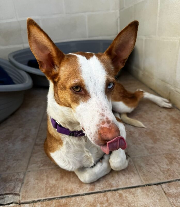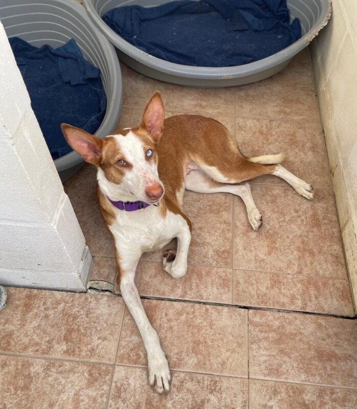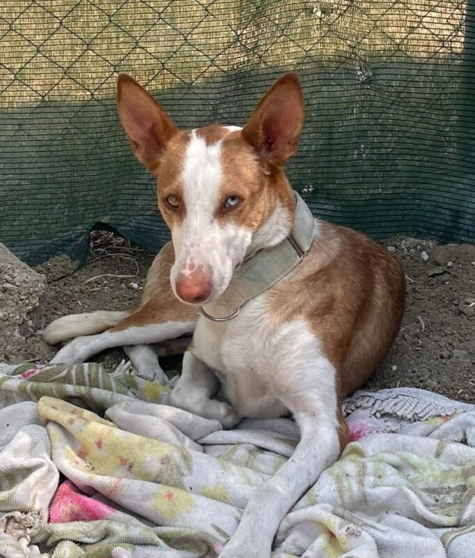 Iris es más tímida y más cautelosa que su hermano , aún le falta por confiar en el ser humano pero hemos visto una mejoría y estamos seguros que ya en su casa mejoraría con tiempo y paciencia. Iris es una perra joven y juguetona con los perros y tiene la energía típica de un podenco. También en nuestra prueba básica con gatos ella no mostró interés en el gato.